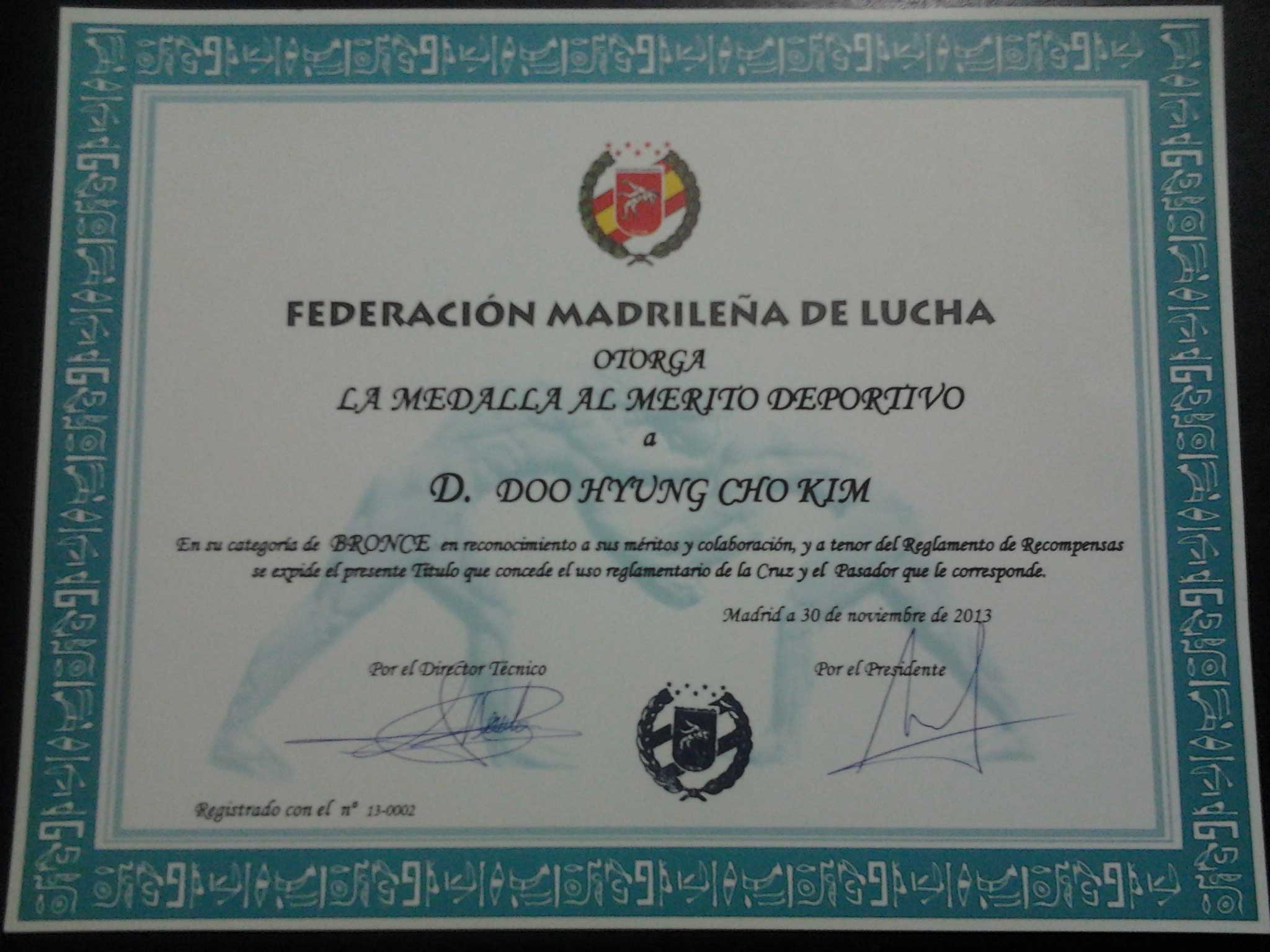 Medalla al Merito Deportivo, otorgada al GM Doo HYung Cho, por la Federación Madrileña de Lucha