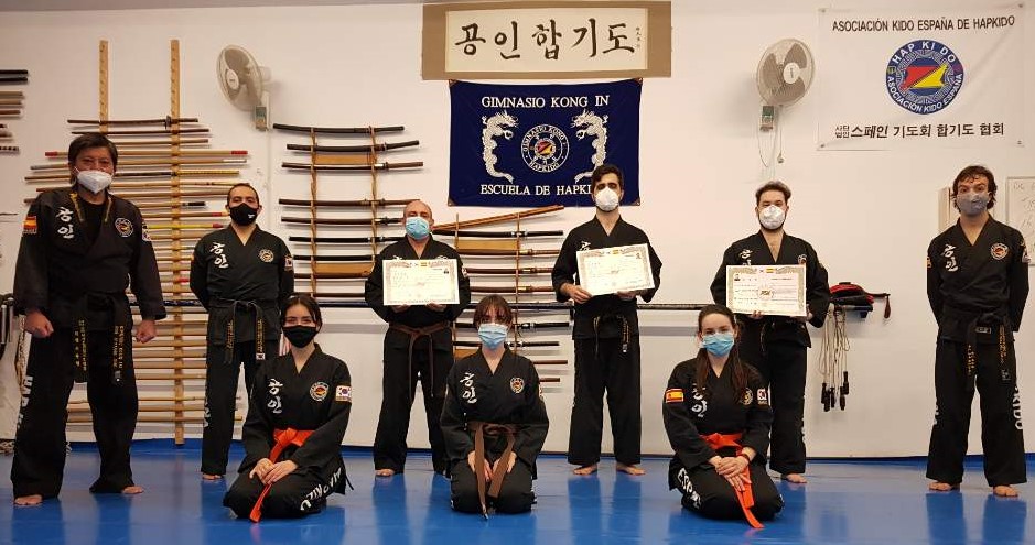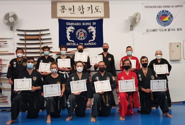 Para cumplir la Normativa vigente en prevención COVID-19, se adelanto al viernes 26 en horarios separados..Alumnos de la Asociación Kido España de Hapkido, después de la entrega de diplomas, junto al GM CHO