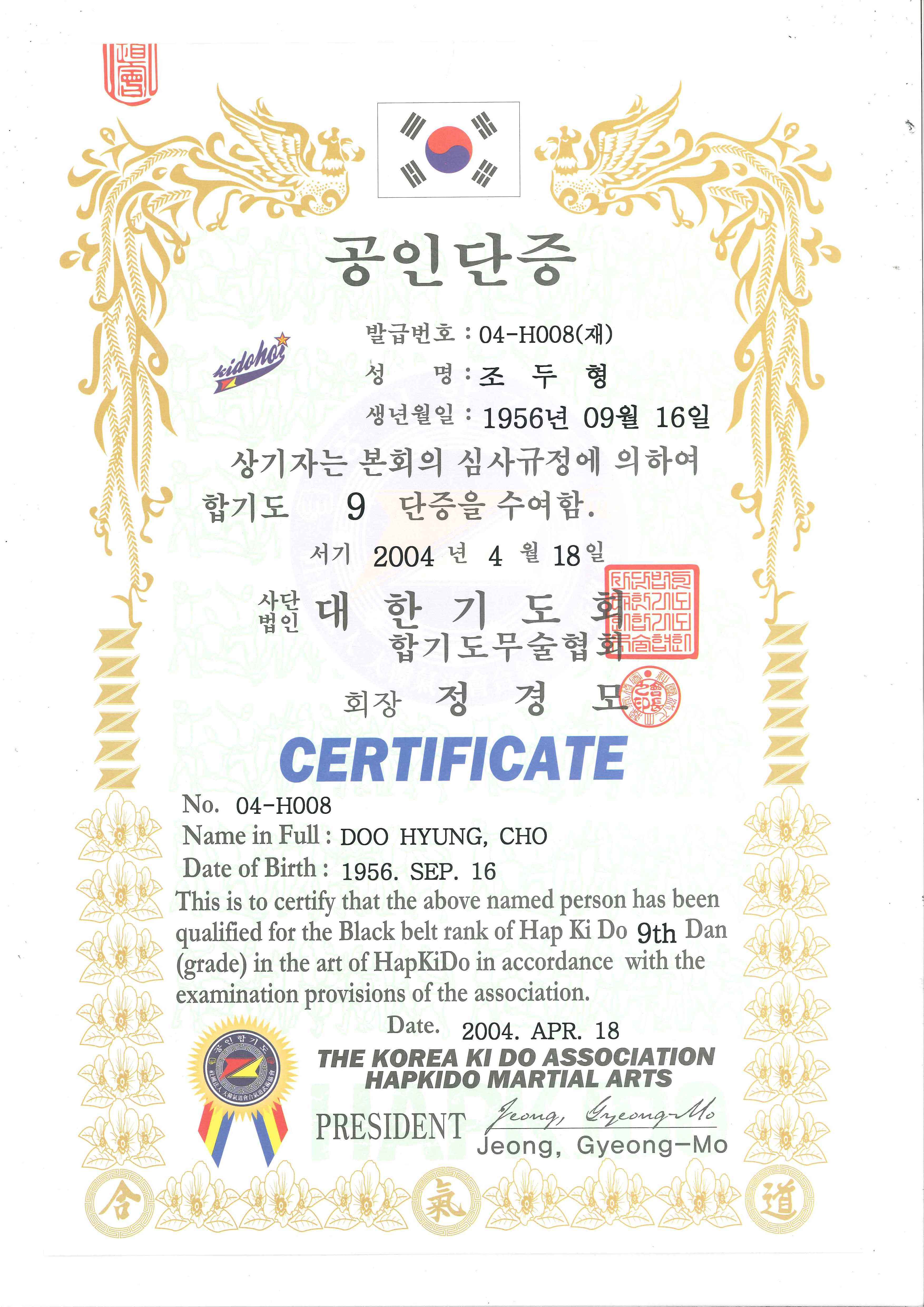 Titulo del nombramiento del GM Doo HYung Cho, como 9° DAN de The Korea Kido Association Hapkido Martial Arts